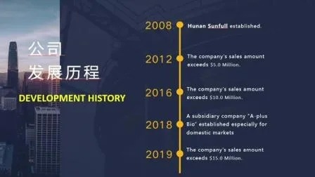 हम प्राकृतिक पौधों के अर्क के अनुसंधान और विकास, उत्पादन और बिक्री में 20 से अधिक वर्षों के पेशेवर अनुभव के साथ एक उच्च तकनीक उद्यम हैं। हमारी कंपनी ISO9001 सहित कई प्रमाणपत्रों को धारण करती है,आईएसओ 22000/एचएसीसीपीहमारे प्रसिद्ध ट्रेडमार्क में Sunfullbio, SunepicaTM और TeavitalTM शामिल हैं।