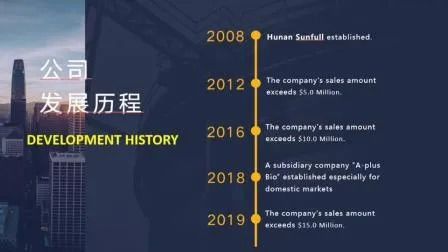 हुनान सनफुल बायोटेक कंपनी लिमिटेडप्राकृतिक पौधों के अर्क के अनुसंधान एवं विकास, उत्पादन और बिक्री में विशेषज्ञता के 20 से अधिक वर्षों के पेशेवर अनुभव के साथ एक उच्च तकनीक उद्यम है। कंपनी ISO9001, ISO22000/HACCP, KOSHER,और हलाल प्रमाणपत्र, जिसमें Sunfullbio, SunepicaTM और TeavitalTM जैसे प्रसिद्ध ट्रेडमार्क हैं।